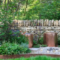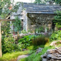 We researched and found the materials for this garden over a six month period, scouring the Yorkshire Dales and striking gold, so to speak, when we discovered the Bolton Estate at Bolton Castle, Wensleydale in North Yorkshire. They kindly allowed us to borrow stone from the beautiful landscape. We used their walling stone for both the dry stone walls and the Creamery building. Large rocks from the moors, gravel and boulders from the nearby beck were also used. The quoins, bridge stone, sills and paving slabs were supplied by Abacus of Holmfirth.